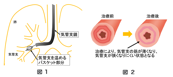 吸入ステロイド薬を主体とした吸入療法が基本的治療ですが、重症例にはIgE抗体などによる抗体療法を行っています。さらに、難治性喘息に対しては、2015年より気管支サーモプラスティ(気管支温熱療法)を導入しています(兵庫県下初)(図1、2)。気管支サーモプラスティはまだ新しい治療ですが、発作回数の減少などの良好な効果が得られています。